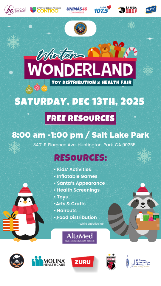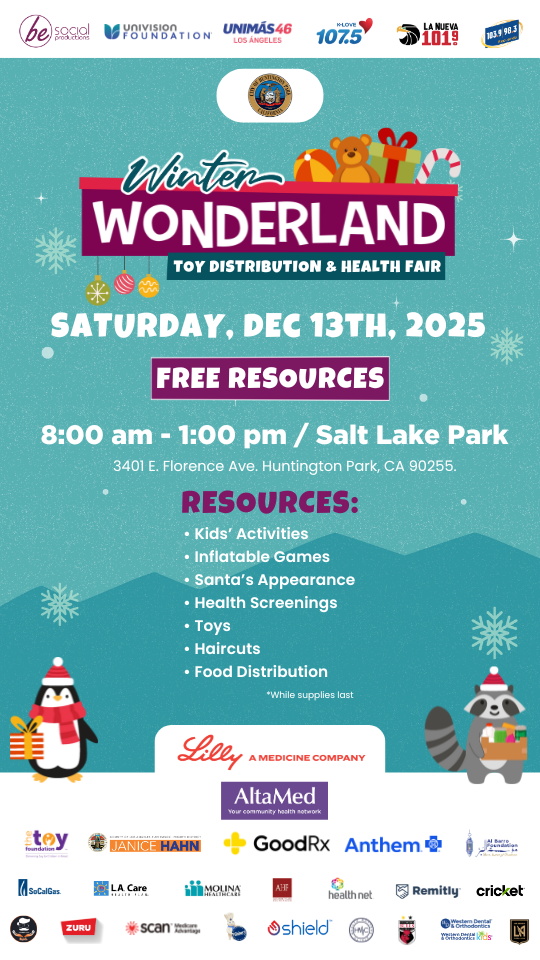 On December 13th, we’ll celebrate our annual Winter Wonderland Toy Distribution at Salt Lake Park in Huntington Park, connecting with over 7,000 community members. Families will enjoy live entertainment, family activities, and bilingual engagement, while children receive free toys and resources. Join us in spreading joy and making a meaningful impact this holiday season.